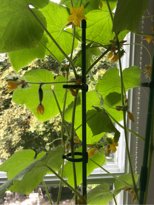Antalet klämmor du behöver beror på växtens storlek och struktur; för mina gurkplantor har jag placerat en klämma vid varje delning för att ge extra stöd åt bladen. De klättertrådar som gurkplantorna utvecklar kan också fästa sig vid stödpinnarna för extra stabilitet.